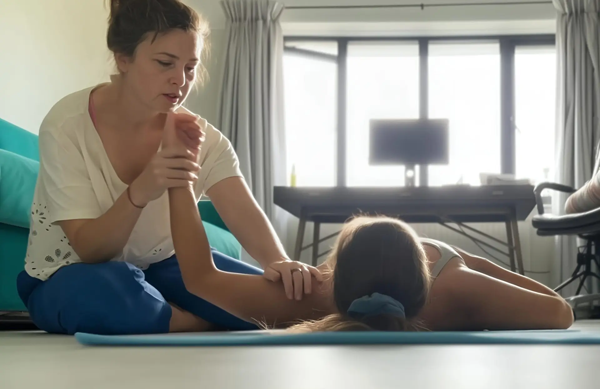 Verity is working with a client to assess their shoulder, rib and neck alignment